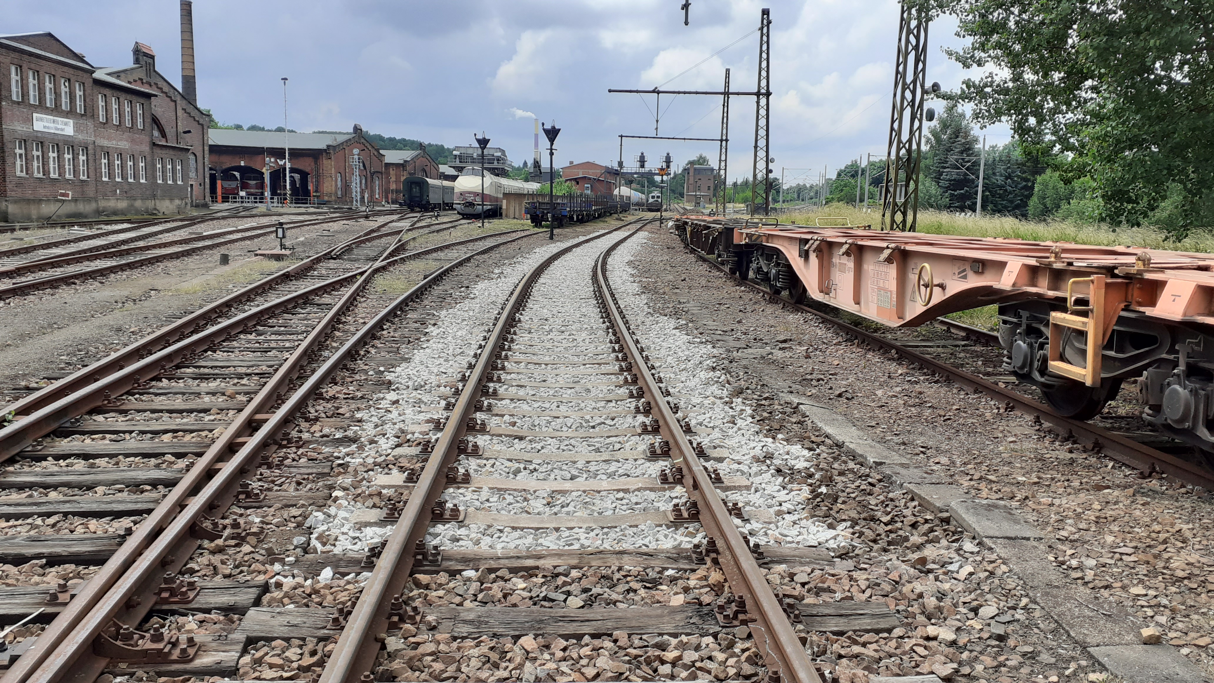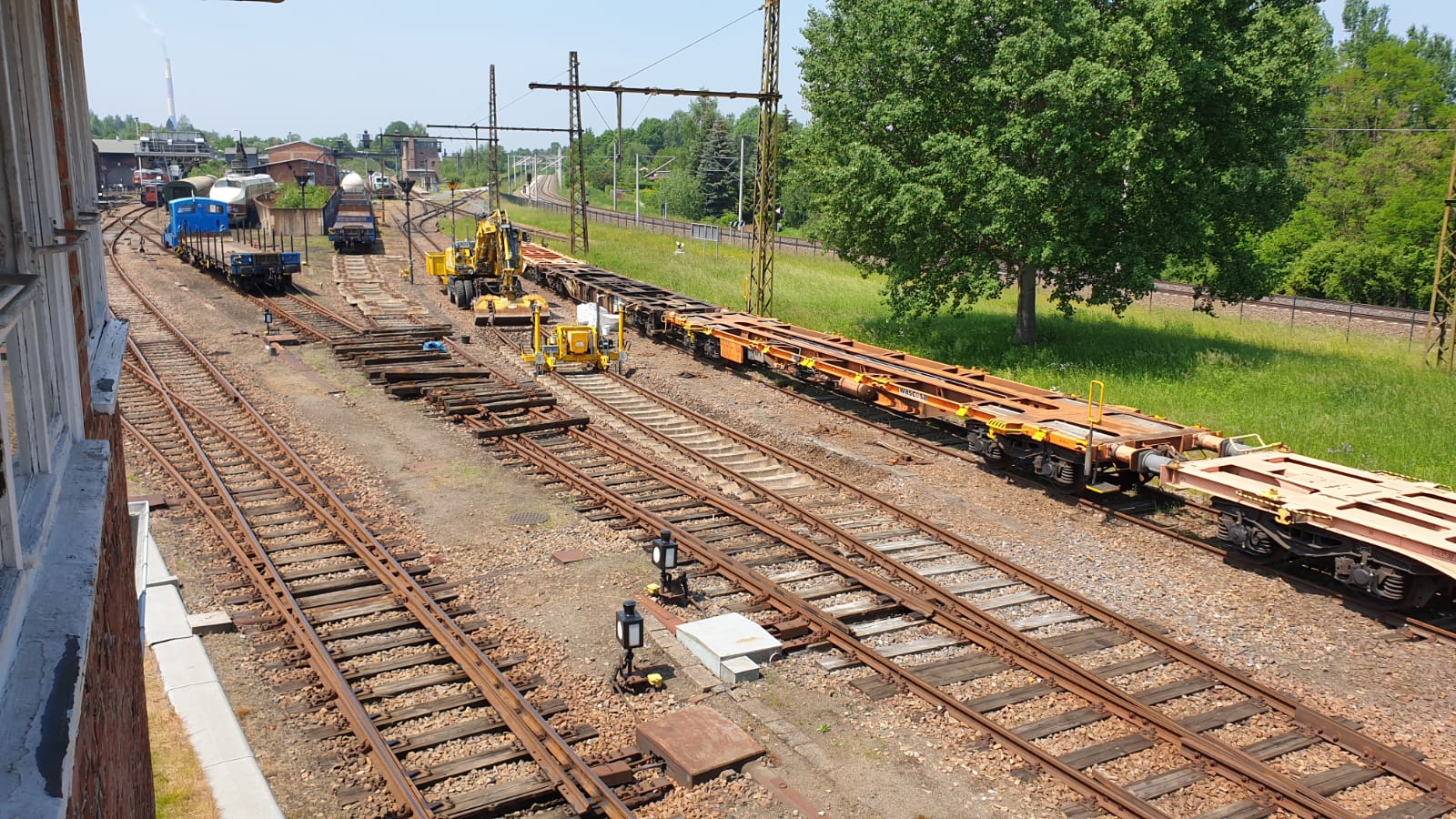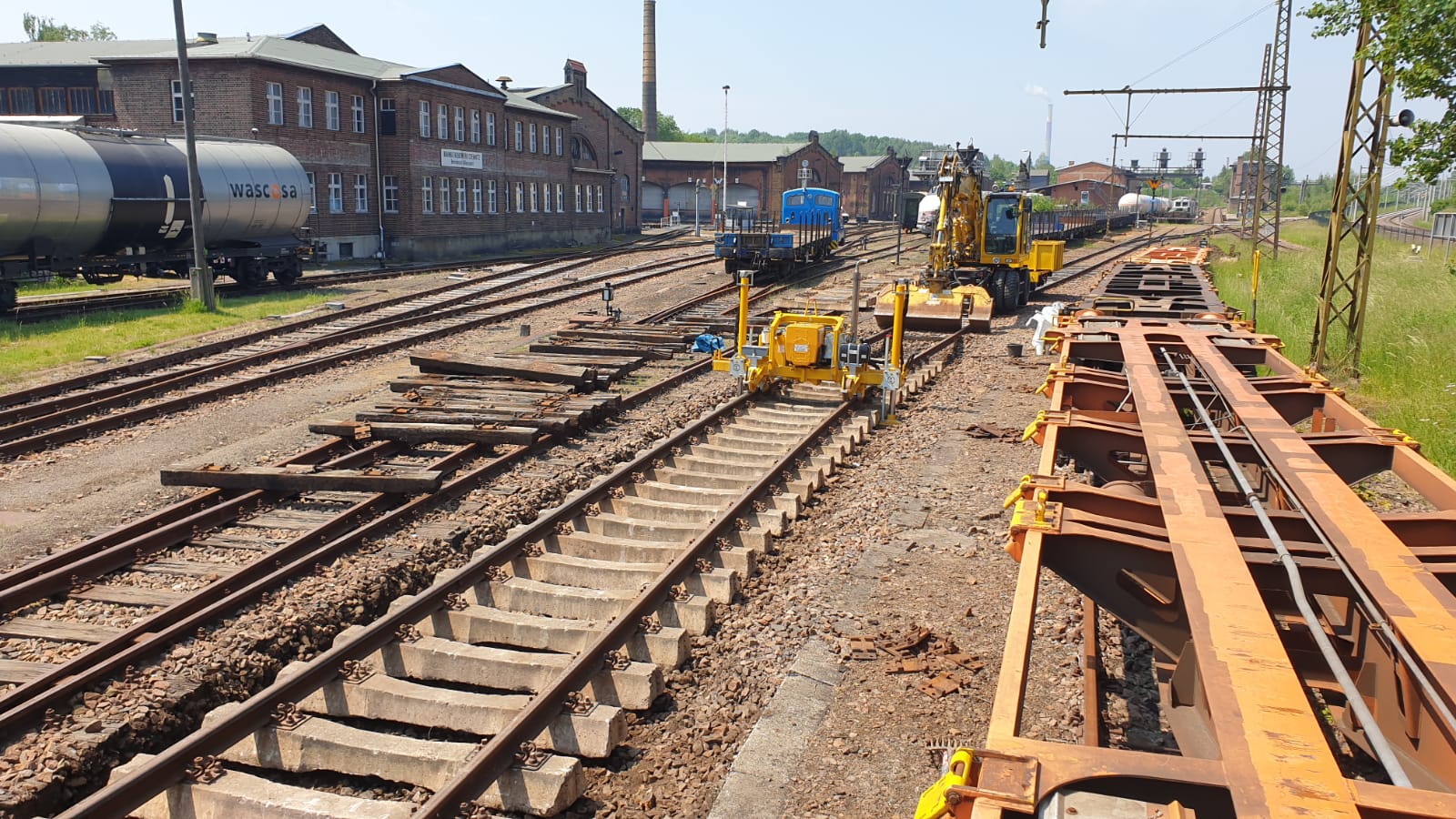 Nun sind wir in der Lage, in den nächsten Jahren Stück für Stück die Brennpunkte unserer Gleisanlagen zu sanieren. Hierbei geht es vor allem um die drei, recht zentral im Gelände liegenden Doppelkreuzweichen sowie drei weitere einfache Weichen der westlichen Zufahrt. Grundlage für Instandsetzung dieser Weichenstraße war allerdings die Schwellenerneuerung der zweiten Zufahrt über den östlichen Teil. Hier konnten im Juni mit Hilfe der Firma Lasch GmbH, Zwickau die maroden Holz- durch Betonschwellen ersetzt werden.