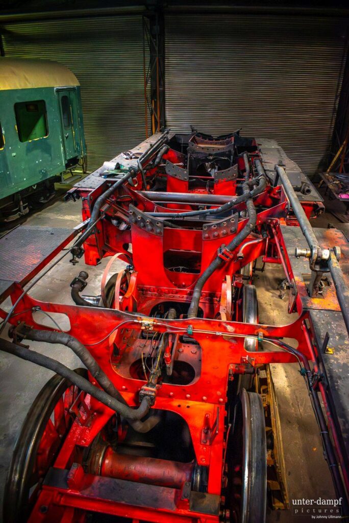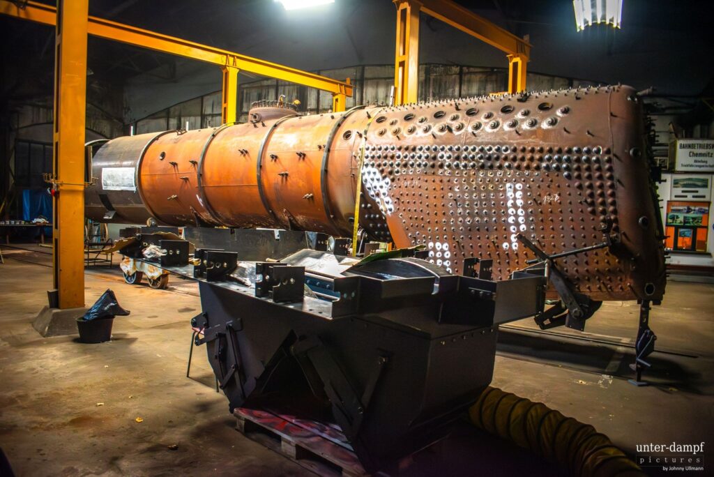 Zu Beginn diesen Jahres konnte schließlich der Kessel vom Fahrwerk abgehoben und auf eine, eigens angefertigte, Drehvorrichtung gesetzt werden. Im März begannen dann die eigentlichen Arbeiten am Dampfkessel. Die Rauchkammer wurde komplett erneuert, ebenso beide Rohrwände. Auch die Feuerbüchsdecke und sämtliche Deckenstehbolzen wurden ersetzt. Darüber hinaus mussten über zwei Drittel aller Stehbolzen erneuert werden – eine echte Fleißarbeit.