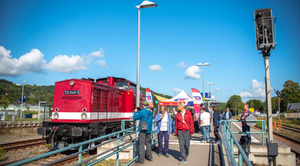Wir hatten die Ehre, Teil der Feierlichkeiten zu sein. Mit unserem historischen Museumszug sowie einer Diesellokomotive der Baureihe V100 fuhren wir an zwei Tagen jeweils zwei Umläufe Chemnitz – Aue (Sachs) mit Halt an den größeren Stationen. Zur Freude aller konnten wir viele Besucher und Fahrgäste in den Zügen begrüßen.