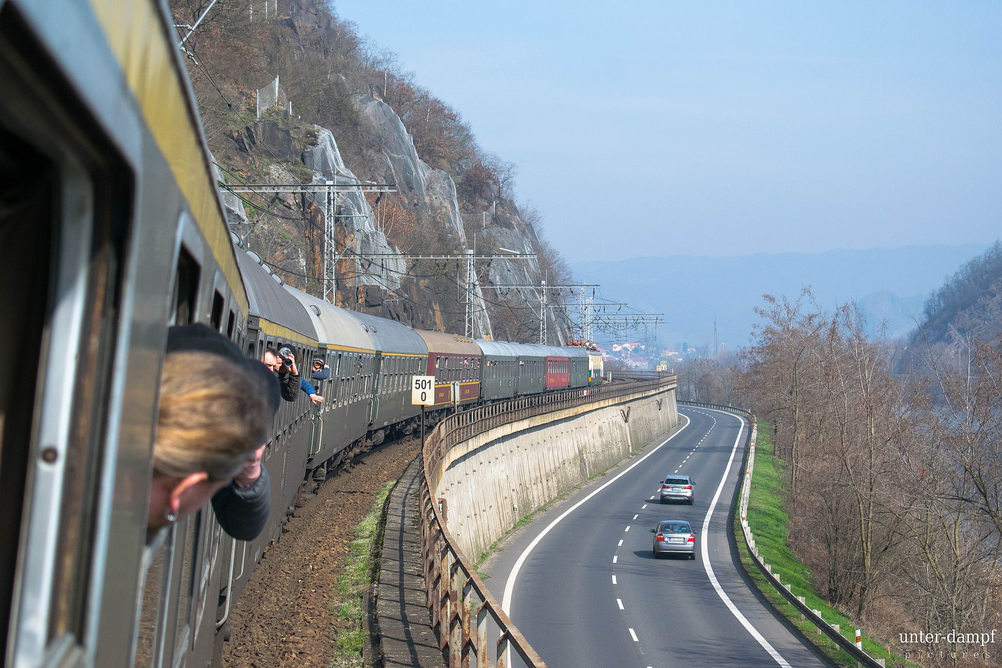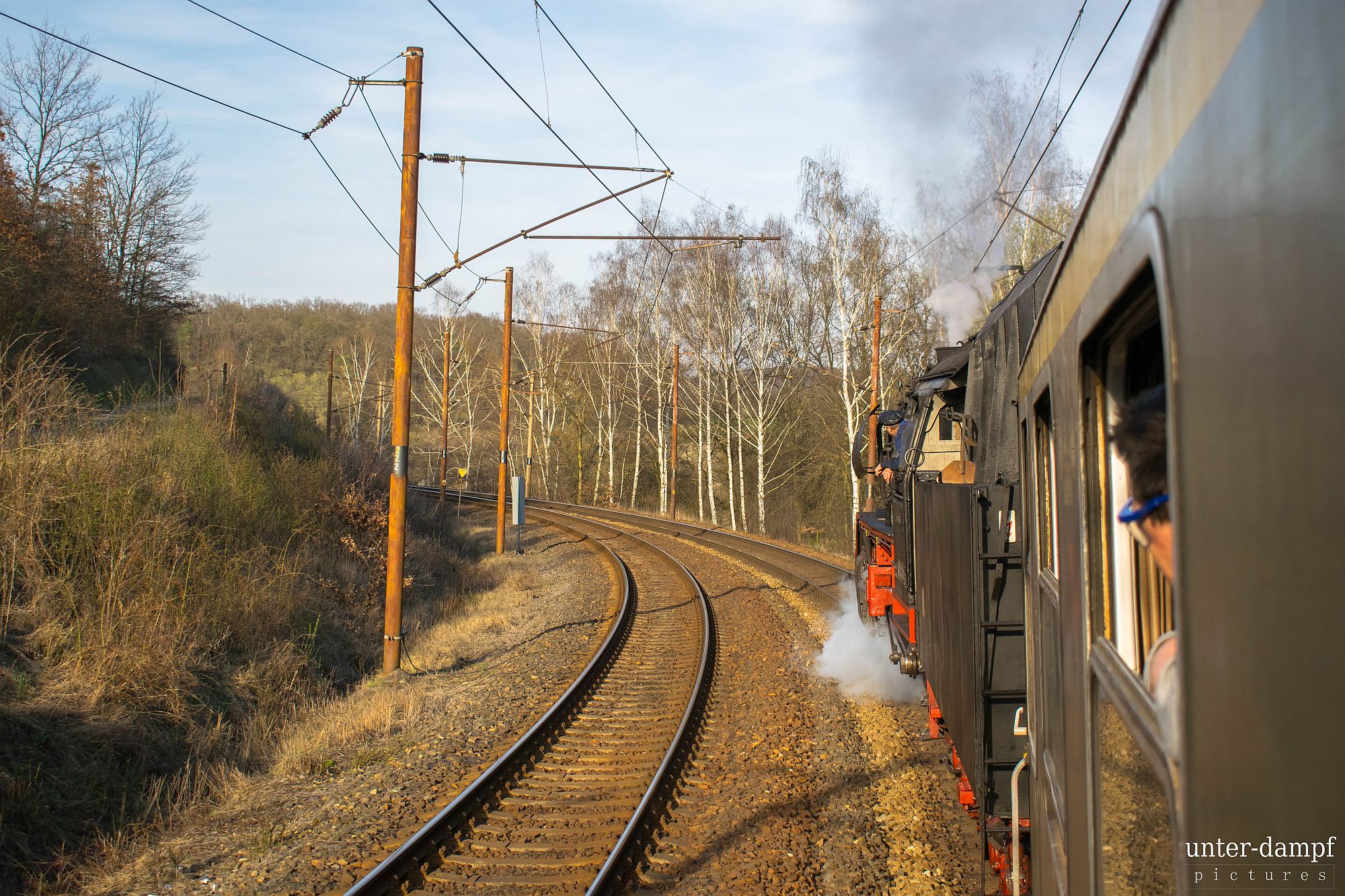 Früh morgens starteten in Zwickau bzw. Cottbus jeweils ein Zugteil die dann in Dresden vereinigt wurden. Mit zwei Dampflokomotiven sowie einem Zug, bestehend aus 15 Wagen, ging es durch das Elbtal nach Tschechien. Bei mehreren spektakulären Parallelfahrten konnte hautnah die Dampfloktechnik erlebt werden. Am frühen Nachmittag wurde das Tagesziel Ústí nad Labem erreicht. Hier bestand die Möglichkeit für mehrere Ausflüge z.b. eine Fotofahrt nach Bílina. Am Abend starte dann wieder der Zug gen Heimat. Dies war eine Gemeinschaftssonderfahrt von Flügelradtouristik, Lausitzer Dampflokclub und IG Traditionslok 58 3047 aus Glauchau.