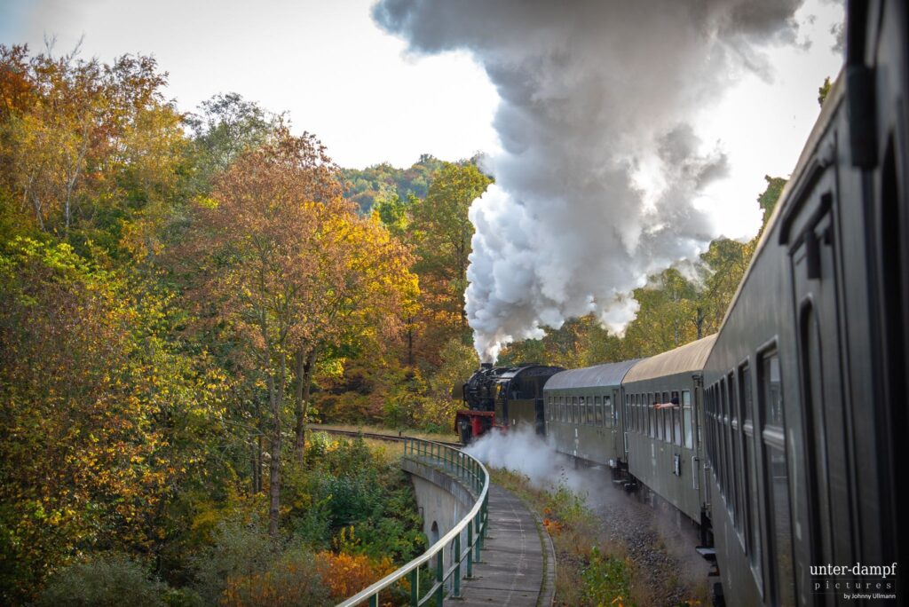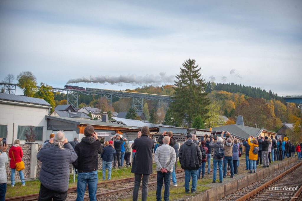 Am Sonntag führte uns die Fahrt dann durchs herbstlich gefärbte Erzgebirge nach Schlettau und Schwarzenberg. In Markersbach stand eine spektakuläre Scheinanfahrt auf dem großen Viadukt auf dem Programm, ein absolutes Highlight für alle Mitreisenden und Fotografen entlang der Strecke. Auf der Rückfahrt legten wir außerdem noch einen kurzen Stopp im Eisenbahnmuseum Schwarzenberg ein, bevor es wieder Richtung Heimat ging.